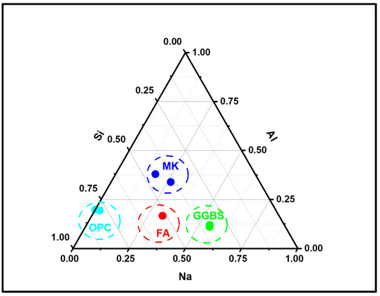 EDX mapping was carried out to map elements in the paste system and is shown in Figure 12. In the alkali-activated fly-ash paste, Na, Si, Al, and Ca were mapped. Si and Al color intensities are higher than Na and Ca, while the Ca has the least intensity. For the GGBS paste, the intensity of all the elements, such as Na, Si, Al, and Ca, is equally distributed throughout the spectrum area. In the MK paste, the mapped elements show the high intensity of Si and Al but the lower intensity of Ca elements. Lastly, Ca, Si, and Al elements are seen in the OPC paste with a higher Ca intensity. The ternary plot of Ca vs. Al vs. Si and Na vs. Al vs. Si is illustrated in Figure 13 and Figure 14.