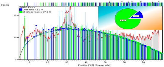 High calcium aluminosilicate binders such as GGBS primarily produce calcium-aluminosilicate-hydrate (CASH) gel. Along with the CASH gel, the presence of various other types of gels, such as CSH, NASH, and (N, C)-ASH, are also developed in small amounts [35,36,37]. The problem associated with CASH gel is the quick setting and leaching of calcium ions from the binder system. Since CASH gel provides superior mechanical properties, it attracts many investigators across the globe. Compared to CSH gel, Ca/Al is higher in CASH gel, which typically has a lower Ca/Si ratio and a higher Si/Al ratio.