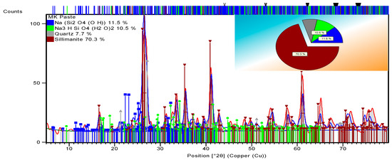 The quartz chemical compound is mainly an inert crystalline mineral in alkali-activated FA and MK. The peak of SiO2 is observed at 26.70°, and 26.56° in the FA and MK pastes. The compounds present in the alkali-activated FA are quartz Si3O6, Reyrite Na1.6Ca14Si22Al2O72H8, and natrolite Na16Al16Si24O96H32; the PDF number is shown in Table 6. With the higher content of silica-alumina and low calcium in the FA, after the activation with the water glass solution (NaOH-Na2SiO3), the system was transformed into the 3D NASH structure. MK pastes’ activation resulted in the development of compounds such as NASH Na32Si64H32O160 and Na24Si8H40O48, quartz Si3O6, and sillimanite Al8Si4O20. The NASH peaks were observed at 27.06°,32.47° and sillimanite peaks were positioned at 31.22°, 33.54° in the MK pastes.