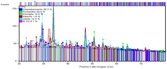 The chemical composition of the paste specimens after a seven-day ambient curing were identified by XRD. Figure 15, Figure 16 and Figure 17 show the XRD results for materials such as alkali-activated FA, GGBS, and MK, respectively, and Figure 18 shows the results for the OPC paste. The base binders were transformed into complex crystalline peaks on the FA, GGBS, and MK activation. FA and MK have more impurities in the compounds present in the system than the GGBS and OPC paste.