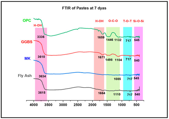 Fourier transform infrared spectroscopy (FTIR) was performed to find the chemical bond present in the low-calcium and high-calcium paste cured at seven days. FTIR spectra of the low calcium (FA and MK) and high calcium (GGBS and OPC) paste are shown in Figure 20. The presence of various chemical bonds in the pastes included H-OH (bending and stretching band), OCO (absorption band), TOT (T: tetrahedral Si or Al), and Si-O-Si bonds. In FA, GGBS, MK, and OPC, the H-OH water bond is observed at the intensities of 3615, 3634, 3610, and 3336 cm−1, respectively. The structural water bond is noticed at 1664, 1671, and 1659 cm−1 for FA, GGBS, and OPC, respectively, while there is no structural water bond in the MK [71].