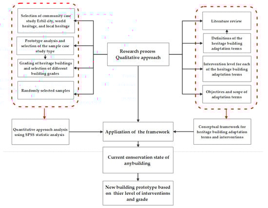 The first step was to create a definition framework based on an intensive literature study and a categorization to construct terminologies that aid in recognizing the different types of terms used in adaptation projects. The second step involved evaluating the selection criteria and deciding on the community and case study. Using the framework, the present state of conservation of the case studies was analyzed to develop new typologies depending on the level and degree of intervention. In-depth analysis and investigation of the current state of the Erbil Citadel was conducted using the framework model and using SPSS to find the correlation between the building’s grade and architectural significance, as well as the level and extent of adaptation. Thus, a qualitative approach via the literature review was conducted while a quantitative approach was conducted using the framework as a checklist and then evaluating it using SPSS Figure 1.