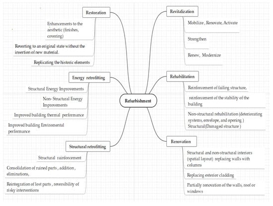 Another classification for building adaptation initiatives was introduced in the study by Shahi et al., (2020), derived from an extended literature review. The two categories established were refurbishment and adaptive reuse [20]. Each of these categories was divided into subcategories, which include several terminologies; refurbishment was divided into retrofitting, renovation, rehabilitation, restoration, and revitalization, whereas adaptive reuse included material reuse, conversion, transformation, modernization, and reconstruction. Furthermore, all subcategories were divided into two types according to their characteristics, as structural and nonstructural [20]. The term “building refurbishment” refers to enhancing the present status of a structure and improving it for its existing uses [21]. Retrofitting, renovation, and rehabilitation are subcategories of refurbishment. Meanwhile, adaptive reuse refers to the process of converting the function of a building into a new one, which includes reusing an existing structure and utilizing salvaged components from a building for a new function (i.e., reusing materials).