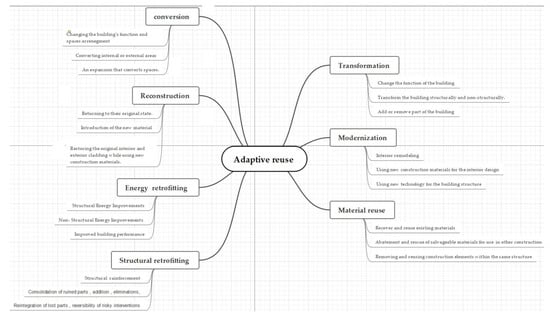 Functional adaptation involves changing or modifying the building’s uses or functions to comply with adaptability solutions; it can be expanded to include the entire structure and its components. Functional changes are labeled as adaptive reuse, which comprises the following terminology based on the scope and types of interventions involved: transformation, modernization, material reuse, conversion, and reconstruction.