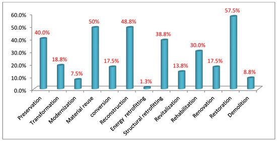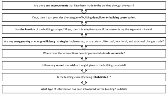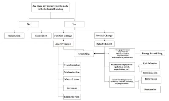 Previous research generally dealt with buildings physically or both physically and functionally, without considering buildings that have been refurbished without being structurally modified or that have not been under any type of adaptation intervention. As a result, two types of typologies were added to the framework, falling under buildings that have not been refurbished recently. As a result, these interventions could be divided into two types according to the current state of the building (preserved or demolished), and then further subcategorized, as shown in Figure 4.