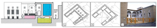 Figure 6. Detail of a heritage building in the citadel with historical value. (a) Basement floor plan. (b) Ground floor plan. (c) View of the building. - The building’s aesthetical and architectural significance.