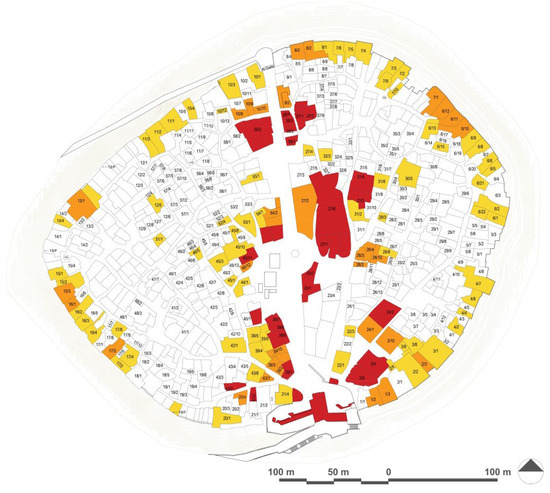 A score of 3 indicates that the building is of great architectural importance, a score of 2 indicates moderate importance, and a score of 1 indicates low importance. The study showed that the majority of grade 1 buildings had great importance due to their high level of originality, the uniqueness of their building materials and components, and their spatial layout (Figure 1). However, the most significant factor was the strategic position and size of these structures because they were generally located in the district of Sarai and belonged to individuals with considerable political and social status. According to Figure 10, more than 57% of the selected buildings had moderate architectural importance, whereas 42% had high architectural importance. These buildings could be found in different areas around the citadel. Most of the buildings within the grade categories had poor architectural value, and only 37% had moderate architectural value. Shack buildings were of very low importance; they tended to deteriorate because of poor construction quality, and they received the least number of interventions because they had no heritage or architectural value.