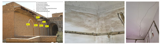Restoration is typically accompanied by material reuse interventions, as shown in the preceding example, which is the second most common practice in refurbished buildings with a frequency of 50%. Material reuse involves the use of the original material, if available, or a new material that has the same physical appearance or material properties as the original material. However, many structural problems appeared in buildings owing to inefficient material reuse and restoration interventions; the example in Figure 13 shows the Rashid Agah House.