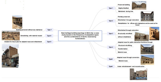 This framework was used to assist in the identification of the types of terminologies engaged in adaption programs for the selected case studies in the Kurdistan area. This study classified building adaptation into four major categories: conservation, refurbishment, adaptive reuse, and demolition. Each of these could be subdivided into subcategories according to the scope of each procedure included and its interventions.