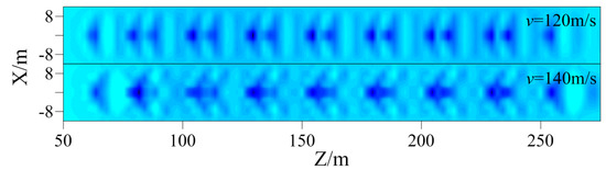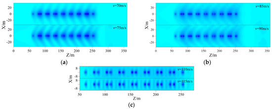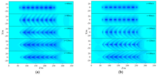 The vertical displacement curves of the track considering different train speeds are shown in Figure 5. Here, we ignored the difference in the vertical displacement induced by the train head and subsequent carriage, and the maximum vertical displacement of the track induced by the moving load was adopted to ensure a more conservative result. As shown, the vertical displacement form of the track changes as the train speed increases. It is well known that there are two classical response patterns of the subgrade with increasing train speed, i.e., with or without wave propagation over the ground. The change in the displacement pattern is more evident when observing the contour plot of the surface in the x–z section, as shown in Figure 6. For the DCG and SCG models, the Mach cone is easy to distinguish.