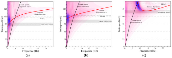 Contour plot of the dispersion relationship of the track system and the ground in the frequency–speed domain: (a) DCG model; (b) SCG model; (c) CFGG model.