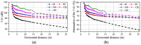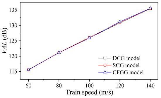 The distribution and attenuation of the VAL are shown in Figure 11, Figure 12 and Figure 13. Taking the DCG model as an example (Figure 11), the increase in the train speed led to an increase in the VAL. The VAL decayed rapidly at first and gradually became stable with the distance from the center of the railway. Moreover, the increase in the train speed also led to an increase in the attenuation rate of the VAL.