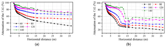 Before illustrating the distribution of the VAL of the alternate models, the variations in the VAL of the track versus the train speed under different ground reinforcement measures are shown in Figure 12. The VAL linearly increased with increasing train speed by around 115–135 dB. Additionally, the ground reinforcement measure was found to have a negligible influence on the VAL. That is, the differences in the VAL distribution were only reflected in the attenuations, along with the distance from the center of the railway, as shown in Figure 13.