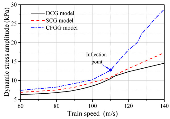 The vertical dynamic stress amplitudes at 4 m depth versus the train speed based on different models are depicted in Figure 15. It is quantitatively shown that the dynamic stress increased with the increase in the train speed. Furthermore, the ground treatment measure was found to increase the dynamic stress in the embankment. The higher the stiffness of the composite ground, the larger the dynamic stress. Regarding the CFGG model, a better prediction of the dynamic stress is expected when there is no wave propagation on the surface owing to the constant difference from the other models. However, an inflection point evidently occurred at a train speed of around 110 m/s. The dynamic stress difference between the SCG and CFGG models became more and more significant once the train speed exceeded critical speed II. Under the condition of a train speed higher than critical speed II, it is valid that the CFG pile reinforcement confined the vibration to the embankment, isolating the wave propagation from the embankment to the ground as well as increasing the dynamic stress in the embankment.