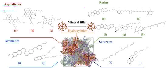 - Li, D.D.; Greenfield, M.L. Chemical compositions of improved model asphalt systems for molecular simulations. Fuel 2014, 115, 347–356. [Google Scholar] [CrossRef]