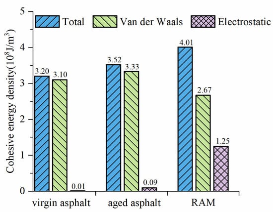 Cohesive energy density (CED) can assess the intermolecular bonding strength, which refers to the energy required to remove a given molecule from its nearest neighbor. The CED results calculated from virgin asphalt, aged asphalt and RAM models are illustrated in Figure 6. Total CED consists of van der Waals energy and electrostatic energy, in which van der Waals energy accounts for much more than electrostatic energy, indicating that van der Waals energy plays a major role. CED of aged asphalt is higher than that of virgin asphalt. The reason is that the polarity of asphaltene is higher than that of other components, while there are more asphaltenes in aged asphalt. Moreover, the CED of RAM is also higher than that of aged asphalt. By analysis, the silica particles strengthen the intermolecular interaction of the asphalt. A high CED value indicates that the diffusion ability of molecules in this model is weak, and suggests that external molecules struggle to diffuse into the model. In addition, adding silica particles increases the percent of electrostatic energy and decreases van der Waals energy. The reason is that there is a residual charge on the silicon dioxide atom, and the electrically neutral silicon dioxide molecule will interact due to Coulomb electrostatic interaction. The molecular configuration of the components in the virgin asphalt changes due to the presence of silica molecules, resulting in a decrease in van der Waals energy. The density and CED results of all models are in great agreement with previous studies, as shown in Table 2 [], that is, to a certain extent, the molecular model and force field selected are proper and reliable. Therefore, the RAM model constructed by this method and described in this paper is also reliable for subsequent analysis.