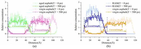In order to analyze relative concentration, the range from 0 ps to 500 ps of the diffusion process in the OZ direction is selected as the object. Figure 7 shows the relative concentration distribution of virgin–aged asphalt and virgin asphalt–RAM at 433.15 K. As can be seen from Figure 7, virgin asphalt–RAM is distributed on both sides of the model when the relative concentration curve is at 0 ps, and no diffusion occurs. At 500 ps, the covering length of virgin asphalt changes from 0–45 Å to 0–58 Å, and the covering length of RAM changes from 45–120 Å to 42–100 Å, manifesting that substances on both sides of the model diffuse into to each other over time, and the main diffusion is from virgin asphalt to RAM. In the middle region, the relative concentration increases from the initial 0 to about 1, indicating that virgin asphalt is fused with RAM. The virgin–aged asphalt and virgin asphalt–RAM models show the same diffusion trend, which means the presence of silica particles does not change the diffusion direction. Compared with Figure 7a,b, after 500 ps simulation, the molecular overlap on both sides in (a) is larger than that in (b), demonstrating that the presence of silica particles causes a decrease in the diffusion depth of virgin asphalt–RAM. Additionally, the covering length of virgin asphalt decreased by 16%, while that of aged asphalt decreased by 21%, revealing that the inhibition effect of silica particles on the diffusion of aged asphalt is more obvious than that of virgin asphalt.