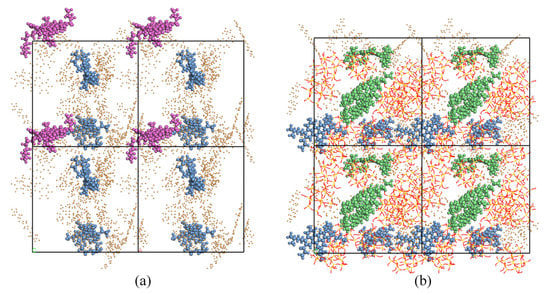 In this study, all the stages of molecular modeling and dynamic simulation were implemented by commercial software, Materials Studio 8.0. During the simulation, a condensed-phase optimized molecular potentials for atomistic simulation studies (COMPASS II) force field was adopted to calculate the bond and nonbond interactions of all atoms in the system, which was widely applied to organic and inorganic small molecules and polymers. It also has been proved that it could predict molecular, molecular liquid and crystal properties accurately. With the method of an atom-based summation, a cut-off distance was selected as 15.5 Å for the van der Waals interaction. As for the electrostatic interaction, a 6 Å cutoff distance was selected with the help of the Ewald summation method. In all simulation processes, a time step of 1 fs was set, and dynamic trajectory and other statistical data were output every 1000 steps. The Nosé–Hoover thermostat was employed to control the temperature and the Berendsen barostat was adopted to balance the pressure.