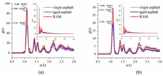 Previous research shows that diffusion behaviors of asphalt are determined by the diffusion ability as well as influenced by the properties of the diffusion receptor []. The effect of diffusion behavior and blend efficiency can be effectively illustrated by characterizing the nanostructure and molecular arrangements of polar components. RDF is an important index to characterize the molecular aggregation and nanostructure arrangement. In mathematics, RDF represents the ratio of the local density of the reference molecule to the bulk density of the models, which can reflect the ordering and stacked state of the molecule distribution. At a certain distance, molecular aggregation can be represented by the characteristic peaks of the RDF curve. Equation (3) is the calculation formula of RDF function.