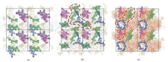 Illustration of the self-aggregation of asphaltenes in asphalt: (a) virgin asphalt; (b) aged asphalt; (c) RAM (2 × 2 repetitive units, blue refers to phenol molecules; green refers to thiophene molecules; purple refers to pyrrole molecules; yellow refers to resin molecules).