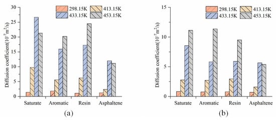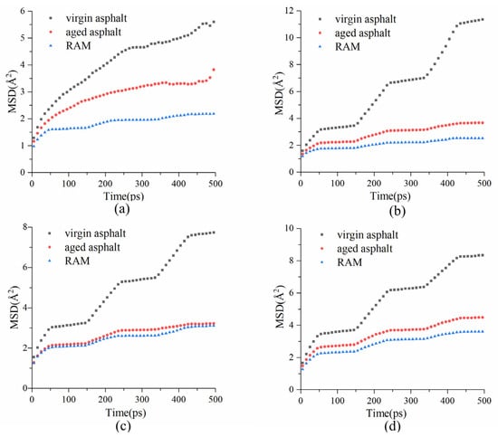 According to Equation (5), diffusion coefficients of SARA components can be obtained and they are shown in Figure 14. Molecular weight determines the distinctive molecular mobility of different components. Molecular weight determines diffusion rates of SARA components of the two asphalts under the action of intermolecular forces and thermal movement. Saturate has the fastest diffusivity, followed by aromatic and resin, induced by the smallest molecular weight and simplest molecular structure. On the contrary, asphaltene with large molecular weight and complex configuration possesses the slowest migration velocity, and tends to self-association because of π–π interaction between benzene rings. Contrasting Figure 14a,b, as the temperature increases, the mobility of the whole model also increases, and the change in the virgin asphalt–RAM is not obvious compared with the virgin–aged asphalt. It is observed that adding silica particles reduces the diffusivity of SARA fractions significantly. The decrease in the saturate fraction is 70%, and the decrease in asphaltene is only 17%. Especially at high temperature, silica particles have a great influence on the migration of nonpolar molecules. The presence of silica particles can reduce diffusion rates of SARA components, but the order of self-diffusion rates does not change.