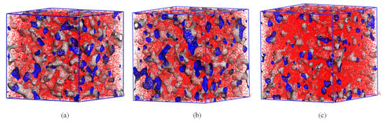 Free volume distributions among asphalts: (a) virgin asphalt (37.3%); (b) aged asphalt (36.4%); (c) RAM (32.1%) (occupied volume: red; free volume: blue; Connelly surface: gray).