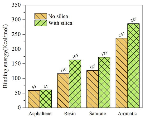 Figure 15 exhibits the binding energies among SARA components of virgin asphalt with aged asphalt (without silica) or RAM (with silica). As shown in Figure 15, all of the calculated Ebinding values are positive, indicating that the intermolecular attraction promotes the diffusion of components. For virgin–aged asphalt, the binding energy between aromatics and aged asphalt is the highest, followed by saturates, suggesting that the nonpolar components play a major role in the diffusion process by having a great attraction. However, the asphaltene and the resin have inferior binding energy with aged asphalt, which means that the diffusion ability is relatively poor.