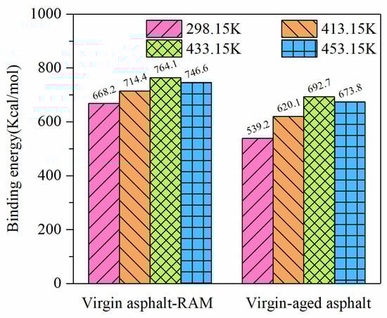 Figure 16 shows binding energies of the virgin–aged asphalt and virgin asphalt–RAM at different temperatures. It is observed that when the temperature increases, the binding energy of virgin–aged asphalt shows a linear pattern of first increasing and then decreasing. The maximum value appears at 433.15 K, indicating that the interaction between components is the strongest at this temperature, and the same trend is observed in virgin asphalt–RAM. Compared with virgin–aged asphalt, the binding energy of virgin asphalt–RAM at each temperature is higher than that of virgin–aged asphalt, which may be due to the presence of silica particles that enhances intermolecular interaction in aged asphalt. The binding energies of both models present the maximum value at 160 °C. According to the above research, increasing temperature can accelerate the diffusion of nonpolar components and improve the binding energy. However, due to the presence of silica particles, the diffusion rate of the saturate component is greatly affected at high temperature, and the aromatic component plays a dominant role in diffusion. Therefore, in order to improve the diffusion capacity, it is recommended to choose a regenerator rich in the aromatic component, which can fully realize the performance recovery of aged asphalt.