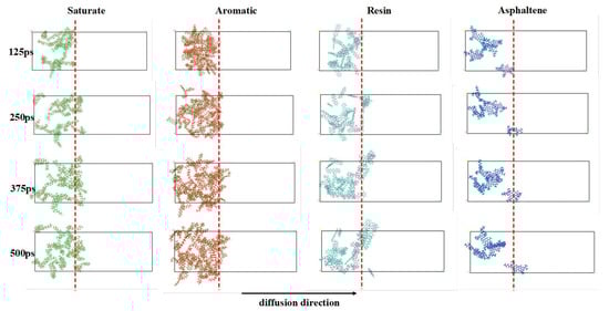 The diffusion behavior for virgin asphalt–RAM is one of the key points to determine whether a homogeneous recycled asphalt can be achieved. The difference in concentration between the two regions will cause mutual diffusion at the molecular level. If the concentrations are equal, the interdiffusion process ceases. Figure 17 shows the evolution of molecules for virgin asphalt–RAM at 433 K during the mutual diffusion. As shown in Figure 17, the snapshots of the model (virgin asphalt–RAM) at the simulation times of 125, 250, 375 and 500 ps are extracted. Virgin asphalt is concentrated on the left side of the simulation box, and the RAM is on the other side. To sufficiently exhibit diffusion processes of virgin asphalt, the molecules of RAM are set to be invisible in sequence. It can be clearly observed that SARA components continuously move across the border and penetrate into RAM with time. It is discovered that SARA components gradually penetrate into the area of RAM. Furthermore, the penetration depth and number of asphaltene molecules in RAM are obviously less than those of the other three components, indicating the lower diffusion capacity.