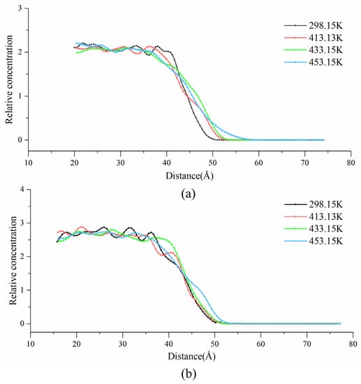 The above phenomenon can well represent the mutual diffusion process of the model, but it cannot quantify the diffusion rate. As shown in Figure 18, the relative concentration of virgin asphalt along the z direction is monitored during the simulation processes. It can be found that the curves of relative concentration have similar shapes even at different simulation temperatures. The relative concentration of virgin asphalt reduces at higher z positions as the temperature increases while it rises at lower z positions, which illustrated the diffusive phenomena of virgin asphalt into RAM, and diffusion processes favorably followed Fick’s second law of diffusion. Under different simulation time steps, the penetration depth can be obtained.