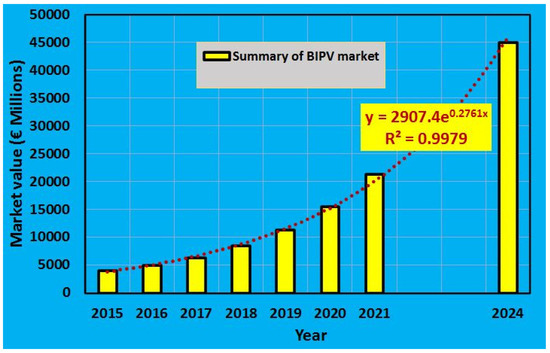 Many research groups have adopted different technologies for the development of transparent BIPV products, namely, windows, skylights, and curtain walls, driven by their high market demand. The overall market size of BIPV is presented in Figure 3. According to the report in Ref. [49], the price of BIPV products is now cost-effective compared to conventional building products and it will be even more cost-effective in the future. In addition to the need for efficiency and lifetime improvement, the BIPV products should have merit in their unique aesthetics and design considerations, such as color, transparency, flexibility, different form-factors, and even being indistinguishable from conventional construction materials, such as architectural glass.