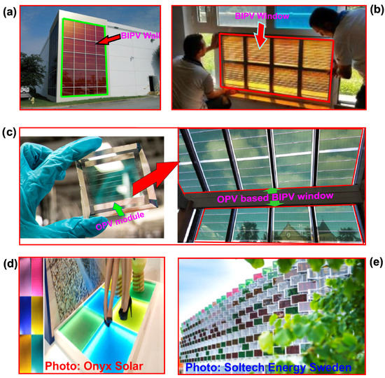 Semitransparent and colored BIPV modules and their applications. (a) DSSC-based red-orange colored wall installation [54], which is marked by the Green rectangular line; System provider. Konarka Technology (this company is out of market [59]), (b) DSSC-based yellow-orange colored window installation marked by the red line; system provider: Daunia solar cell (reproduced and modified from Ref. [53]), (c) OPV module; (image courtesy: Robert Coelius/Michigan Engineering) (reproduced and modified from Refs. [60,61], and OPV based BIPV windows (photo courtesy. Dr. Renaud Demadrille (CEA Grenoble) and OPV modules are made by OPVIUS GmbH, Kitzingen, Germany. www.opvius.com, accessed on 20 November 2022 (reproduced and modified with permission from Ref. [62] (d) PVB polymer-based flooring products (reproduced and modified with permission from https://www.onyxsolar.com) [8], and (e) PVB polymer-based facade elements using thin-film technology (reproduced and modified with permission from www.soltechenergy.com) [8].