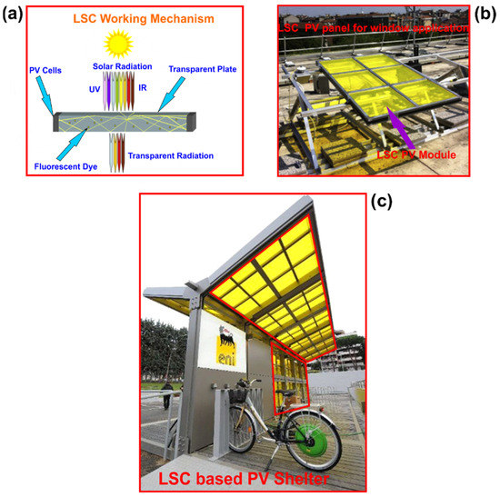 (a) The working mechanism of an LSC PV module (source: ENI Donegani Institute) (reproduced and modified with permission from Refs. [74,75], (b) LSC-based window for BIPV (reproduced and modified with permission from Refs. [74,75], and (c) LSC-based BIPV shelter in Rome, Italy (reproduced and modified from [61,73]).