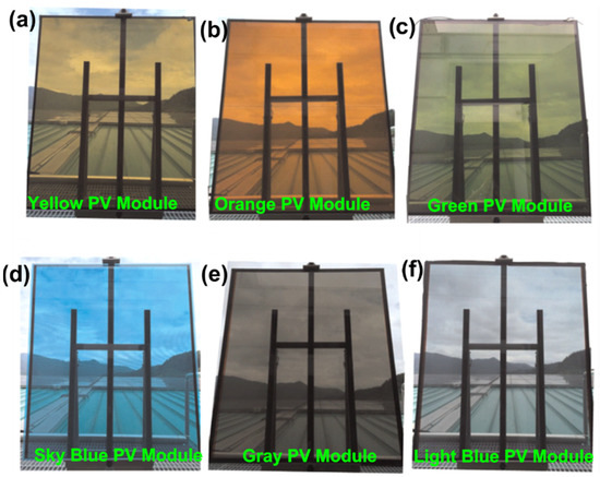 Front views of the fabricated a-Si:H semi-transparent glass-to-glass (GTG) PV module. (a) yellow PV module, (b) orange PV module, (c) green PV module, (d) sky blue PV module, (e) gray PV module, and (f) light blue PV module (reproduced and modified with permission from Ref. [77]).