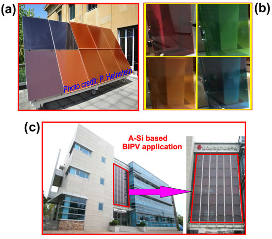 A-Si-based colored BIPV modules and their application. (a) First ever fully homogeneous colored BIPV products (reproduced and modified from [54]); (b) Four different colors commercialized PV modules (reproduced and modified from [78]); and (c) A-Si-based front surface building (reproduced and modified with permission from Ref. [79]).