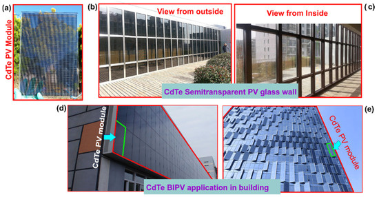 The most efficient semitransparent BIPV glass is that made by Advanced Solar Power (ASP)-China [82], which is based on thin-film cadmium telluride (CdTe) PV materials that are partially removed using laser micromachining to simultaneously achieve transparency and sunlight-to-electricity conversion. The ASP CdTe semitransparent PV glass shown in Figure 9a is currently the best BIPV option due to several reasons, namely: (i) relatively high efficiency (13% compared to 10% for the amorphous silicon counterpart and 3% for clear PV glass), (ii) most cost-effective (i.e., lowest $/peak-watt), (iii) easy to manufacture (compared to crystalline silicon semitransparent glass), (vi) arbitrary transparency (10–90%, depending on how much of the PV material is removed by laser micromachining), and (v) less shadowing effect, as illustrated in Figure 9b,c, which offers beautiful appearance, uniform lighting, and light transmission, hence, a clear exterior view. The BIPV application of CaTd-based PV panels as façade and curtain wall is shown in Figure 9d,e, respectively. Note that the amount of CdTe material in the overall thin-film PV material is ∼0.1% by weight, which is a minimal amount. In addition, because of (i) the small quantity, (ii) low solubility of CdTe, and (iii) module encapsulation, CdTe modules have been considered, at their end-of-life time, as non-hazardous waste according to the Toxicity Characteristic Leaching Procedure [83].