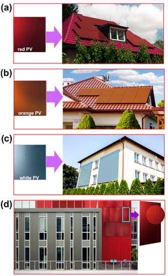 Colored PV modules of FuturaSun and their application (Photos by FuturaSun). (a) Red-colored BAPV (reproduced and modified with permission from Ref. [119]), (b) orange-colored BAPV (reproduced and modified with permission from [119]), (c) silver-colored BAPV (reproduced and modified with permission from Ref. [119]), and (d) red-colored BIPV (reproduced and modified from [120,121] with proper permission).