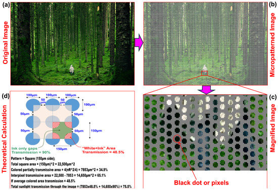 Formation of micropatterned image and light transmission calculation through it. (a) A randomly selected high-resolution nature image (reproduced and modified from [139]), (b) micropatterned image, (c) a magnified view of the micropatterned image, and (d) theoretical calculation of light transmission through a micropatterned image (reproduced and modified from [138]).