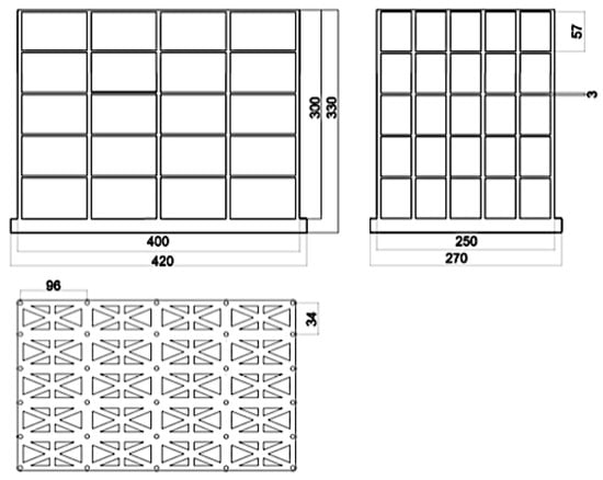 Load-cell scale readings are recorded during the test run for each angle of incidence of the wind air flow. After that, wind protection screens are mounted onto the aeroelastic model, and the recording of the load-cell scale readings is repeated for each angle of incidence of the wind flow. For the sequence of the screen mounting options on the facade of the structure, see Figure 7.