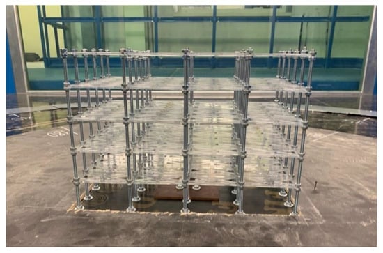 For experimental studies, an aeroelastic model of an industrial tower-type supporting frame is developed and made. The aeroelastic model has a layout size of 250 mm × 400 mm; the height is 300 mm. Permeable floors are uniformly distributed across the structure’s height with 60 mm vertical pitch, starting from the ground level, up to the top elevation mark of the structure. Given the dimensions of the testing section of the wind tunnel, the maximum model scale of 1:100 is selected.