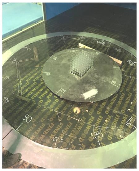 The aeroelastic model of an industrial tower-type supporting frame is installed in the test section of the wind tunnel on a rotary platform to study the effects of the wind direction change (wind flow angles of incidence) on the structure (Figure 6).