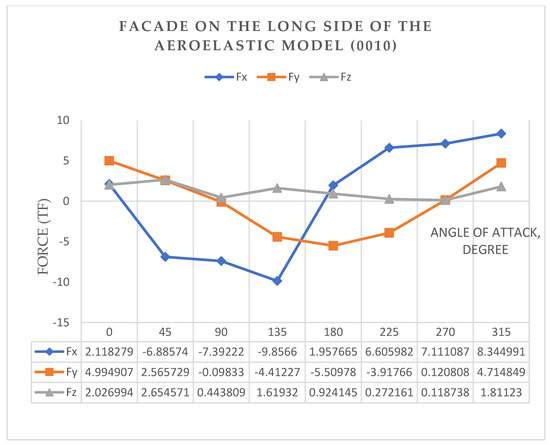 Force curves of Fx, Fy, Fz (tf) for an aeroelastic model with two fronts on the long sides (Option (1010)), when the angle of attack changes from 0° to 360°, are shown in Figure 10.