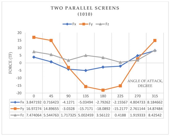 Force curves of Fx, Fy, Fz (tf) when the angle of attack is changed from 0° to 360° for an aeroelastic model with two parallel screens, Option (1010).