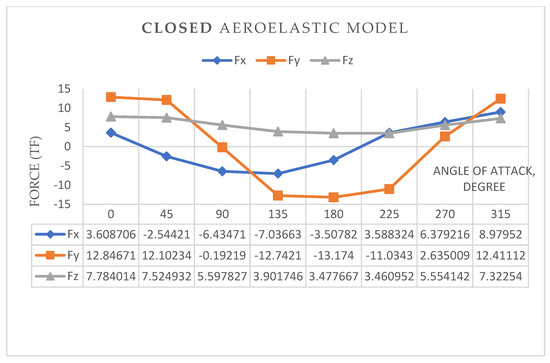Force curves of Fx, Fy, Fz (tf) with a change in the angle of attack from 0° to 360° for the closed model (Option (1111)) are shown in Figure 11.