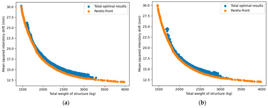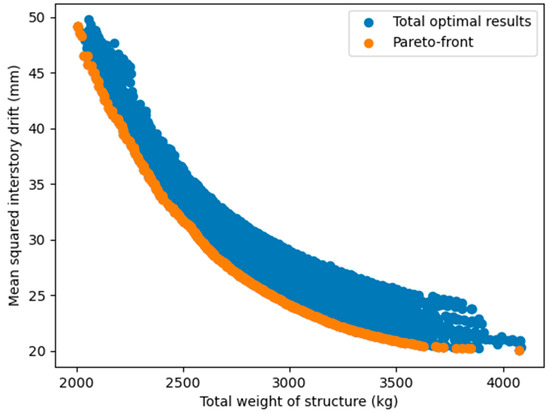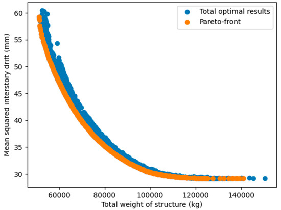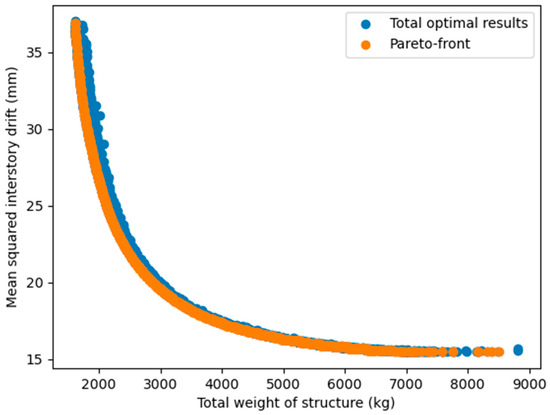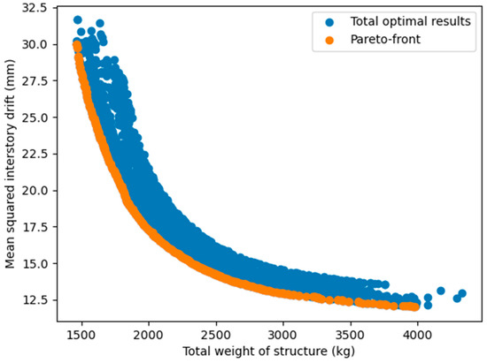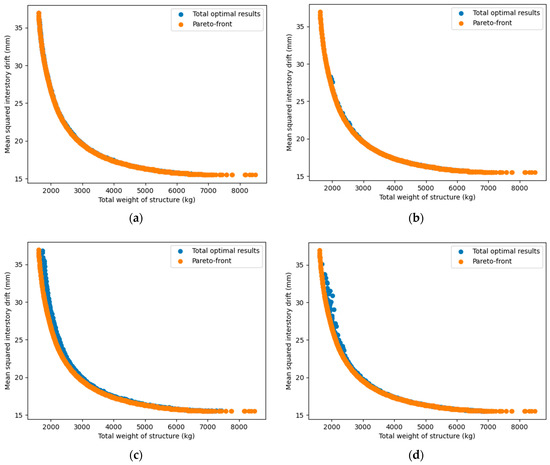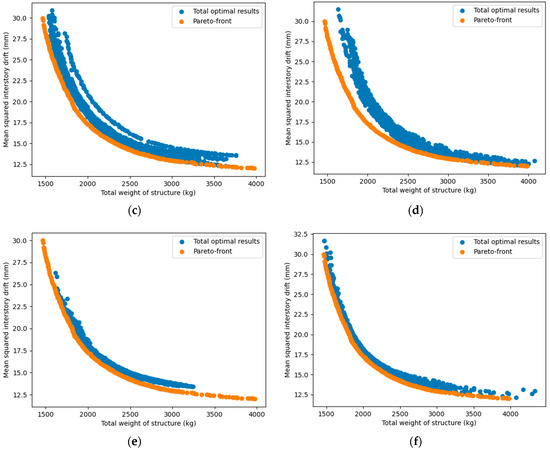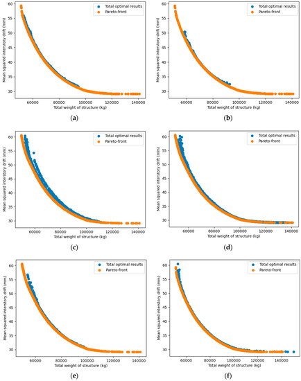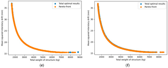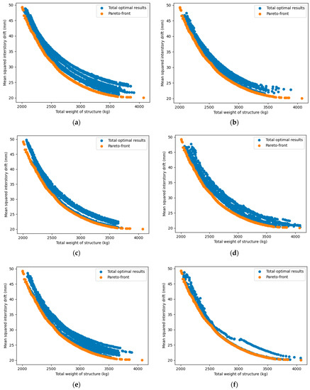 Figure 19, the relationship between two objectives (structural weight and inter-story drift or lateral displacement) was nonlinear and inversely proportional to each other. This was completely consistent with our forecast, and also showed that the use of a multi-objective problem, in this case, was necessary and reasonable. Based on the multi-objective optimization problem built, all six considered MOO algorithms showed a high efficiency since they successfully searched for feasible optimal solutions in all independent runs. Generally, the numerical results proved that no algorithm outperformed the others. However, if we consider the overall performance in all four case studies, NSGA-II and MOEA/D were somewhat more effective in both searching the Pareto and anchor points. Compared to MOEA/D, NSGA-II seemed to find better Pareto solutions, but its stability and optimal solution spread were worse. Among the remaining algorithms, NSGA-III effectively yielded Pareto points, but was less efficient in finding anchor points. OMOPSO also had a good performance, especially in finding the anchor points, but was less stable than MOEA/D. GDE3 and SPEA2 were only average in all case studies.