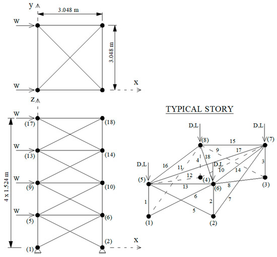 72. The dead load (D), live load (L), and wind load (W) were equal to 100, 50, and 40 (kN), respectively. The information on the load combinations considered was the same as in the first case study. The first objective was the total weight of the structure and the second objective was