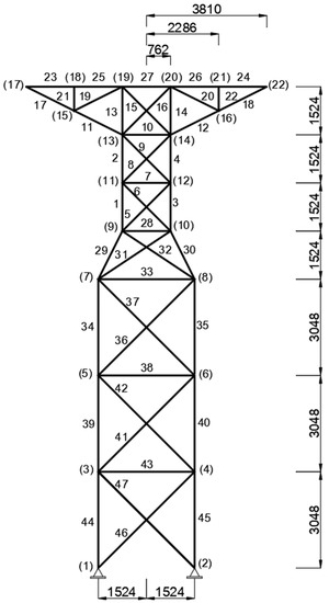 Figure 18. Cross-sectional areas of the member groups were considered as design variables of the optimization problem and were in the range [3870.96, 22,580.6] (mm