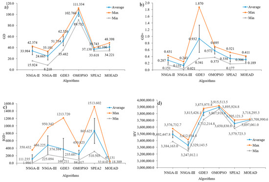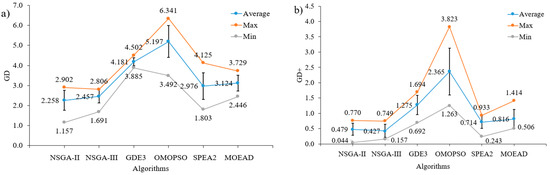 Figure 10a, MOEA/D had the smallest value of GD with 1.557. However, NSGA-II seemed to have a better performance among the algorithms with the smallest average values of 2.044 and dispersion of the results. However, regarding GD+ and IGD+, MOEA/D yielded the best results among the algorithms in terms of both the value and stability. NSGA-II and OMOPSO ranked second, while GDE3 and NSGA-III were not good with GD+ and IGD+, respectively. Regarding the HV indicator, OMOPSO was the best, but was only slightly better than NSGA-II and MOEA/D. NSGA-III was the worst with the smallest value of HV and poor stability.