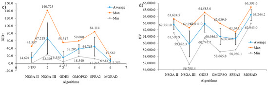 Figure 15a,b, NSGA-II and NSGA-III had the smallest values of GD and GD+. The second was SPEA2 and MOEA/D, and the worst was OMOPSO. Regarding the IGD+ and HV indicators, MOEA/D yielded better results among the considered algorithms while NSGA-III was the worst. GDE3 ranked second with slightly better than NSGA-II.