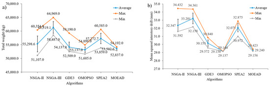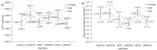 Figure 11a, if the minimization of the total structural weight was important, NSGA-II achieved the smallest result of 1606.1 (kg) and the second was OMOPSO with 1609.4 (kg). However, the stability of OMOPSO was the best with the smallest value of 1614.6 (kg) of runs, and was just slightly better than that of NSGA-II and MOEA/D. In
